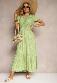 Jasnozielona Trapezowa Sukienka z Bawełny z Bufiastymi Rękawami Falbaną i Gumką w Talii Vimayana. Wizytówka elegancji i romantycznego stylu – tak można określić sukienkę Vimayana o trapezowym kroju, która pięknie podkreśla linię talii dzięki praktycznej gumce (wymiary po rozciągnięciu: M/L – 93 cm XL/XXL – 97 cm). Falbana na dole z gracją podkreśla nogi, a bufiaste rękawy dodają szczypty oryginalnego charakteru. Subtelny dekolt w kształcie litery V idealnie eksponuje szyję i nadaje sukience lekkości – to doskonała propozycja na każdą okazję, od spotkań z przyjaciółmi po romantyczne kolacje. Noś ją z balerinkami i shopperką lub postaw na sandałki na szpilce i torebkę bagietkę.