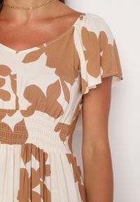 Biało-Brązowa Wiskozowa Sukienka Rozkloszowana z Gumką w Talii Nansalinne. Odkryj urok wiskozowej sukienki Nansalinne, która łączy w sobie klasyczny szyk i nowoczesny styl. Jej rozkloszowany fason podkreśla sylwetkę, a gumka w talii (po rozciągnięciu: S/M - 91 cm, L/XL - 93 cm) zapewnia komfort noszenia i doskonałe dopasowanie. Dekolt w kształcie litery V i rękawy w formie falbanek dodają lekkości i świeżości, co sprawia, że ta sukienka jest idealna na letnie dni, a materiał z wiskozy dba o wygodę. Stylizuj ją na co dzień z wiązanymi sandałami i słomkowym kapeluszem lub wybierz szpilki i biżuterię na randkę. To smart zakup, który posłuży Ci dłużej niż jeden sezon!