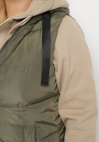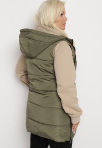 Ciemnozielona Pikowana Kamizelka Dwustronna z Kapturem i Troczkami Nevetiani. Wyobraź sobie chłodne poranki lub ciepłe wieczory w mieście, kiedy potrzebujesz czegoś, co idealnie wyważy styl - oto pikowana dwustronna kamizelka Nevetiani. Z kapturem i regulowanymi troczkami, łączy w sobie funkcjonalność z niebanalnym designem. Kamizelka świetnie sprawdzi się jako modny akcent do casualowych stylizacji z jeansami i sneakersami, jak również będzie wykończeniem eleganckiego looku z prostymi spodniami i botkami.