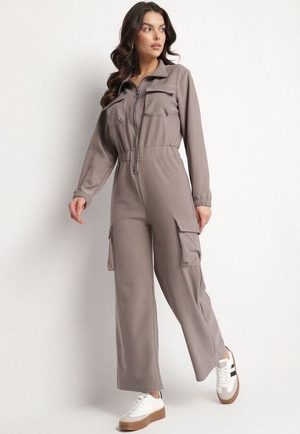 Szary Kombinezon Utility z Szerokimi Nogawkami o Taliowanym Kroju Liarose. Kombinezon Utility z Szerokimi Nogawkami o Taliowanym Kroju Liarose to wszechstronny wybór. Z przodu posiada praktyczne, wsuwane kieszenie. Dzięki taliowanemu krojowi ten model doskonale podkreśla sylwetkę. Idealnie sprawdzi się na co dzień z sneakersami. Z elastyczną gumką w talii po rozciągnięciu max. S\M 52 cm, L\XL 53 cm. Suwak ułatwi zakładanie.