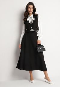 Czarny Garniturowy Komplet 3-Częściowy Koszula z Wiązaniem Spódnica i Kamizelka na Guziki Avalune. Stwórz swój niepowtarzalny styl z garniturowym kompletem Avalune, który łączy w sobie elegancję. Koszula na guziki z wiązanym detalem podkreśli Twoją kobiecość. Idealny na cieplejsze i chłodniejsze dni, zestaw wzbogacony o spódnicę z gumką na suwak, z podszewką oraz kamizelkę na guziki to uniwersalność w najlepszym wydaniu. Załóż go z klasycznymi szpilkami na ważne spotkania.