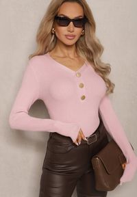 Jasnoróżowy Prążkowany Sweter z Bawełną i Guzikami Mirisia. Odkryj wyjątkowy prążkowany sweter z bawełną i guziczkami Mirisia, który doda uroku każdej stylizacji! Jego dopasowany krój z dekoltem w kształcie litery V subtelnie podkreśla sylwetkę, a minimalistyczny design sprawia, że będzie doskonały na wiele okazji. Na co dzień świetnie skomponuje się z jeansami i sneakersami, a z eleganckimi spodniami palazzo i szpilkami sprawdzi się do biura. Postaw na pewność siebie i styl ze swetrem Mirisia!