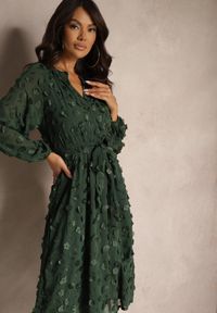 Ciemnozielona Sukienka o Trapezowym Kroju z Paskiem Guzikami przy Dekolcie i Aplikacjami 3D Etinlia. Sukienka Etinlia z podszewką to kwintesencja kobiecości połączona z najnowszymi trendami. Trapezowy fason z paskiem, zaś subtelne guziki przy dekolcie dodają eleganckiego charakteru. Aplikacje 3D nadają kreacji unikatowy wymiar. Ubrana w sukienkę Etinlia będziesz wyglądać stylowo zarówno podczas codziennych obowiązków, jak i na specjalnych okazjach. Wyobraź sobie tę sukienkę zestawioną z uroczy wełnianym płaszczem na lunch z przyjaciółkami lub z dodatkiem perłowych kolczyków i klasycznych szpilek na elegancki wieczór.