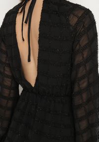 Czarna Błyszcząca Sukienka o Rozkloszowanym Kopertowym Kroju z Odkrytymi Plecami Issanea. Zachwycaj i olśniewaj w sukience Issanea, której rozkloszowany krój doskonale podkreśli Twoją sylwetkę, a wycięcie z tyłu zapewni powiew świeżości i nutkę romantyczności. Długie, przejrzyste rękawy dodają wdzięku, a efektowne, błyszczące zdobienia przyciągają spojrzenia. Wybierz sukienkę Issanea na ważne okazje i stwórz niezwykle elegancką, a zarazem komfortową stylizację. W wersji casualowej zestaw ją ze skórzaną ramoneską i botkami dla rockowego akcentu, a na wieczorne wyjście wybierz szpilki i minimalistyczną biżuterię, aby podkreślić jej szyk. Sukienka posiada podszewkę oraz gumkę z tyłu.