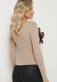 Beżowa Asymetryczna Bluzka z Wiskozą Ozdobiona Kwiatem 3D Veladi. Asymetryczna Bluzka z Wiskozą Veladi to modowy must-have dla każdej fashionistki ceniącej wyrafinowane detale. Pozwala na subtelne odkrycie ramienia, dodając szyku każdej stylizacji. Wizualnym kwintesencją jest aplikowany kwiat 3D, który przyciąga spojrzenia i podkreśla unikalność bluzki. Idealna do zestawień zarówno casualowych, z jeansami i mokasynami, jak i eleganckich, do ołówkowej spódnicy i szpilek - stwarza nieskończone możliwości na każdą okazję.
