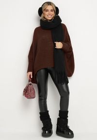 Brązowy Luźny Sweter w Stylu Ponczo Kossela. Swobodny sweter w stylu ponczo to must-have na chłodniejsze dni. Jego niezwykle komfortowy krój zapewnia komfort noszenia i dodaje odrobiny nonszalancji do Twojego wyglądu. Dekolt w łódkę subtelnie eksponuje szyję, a długość rękawa typu batwing dodaje całości oryginalności. Ten sweter to idealna baza zarówno dla codziennych stylizacji z jeansami i trampkami, jak i dla wieczorowych, gdy połączysz go z dopasowaną spódnicą i botkami na obcasie.