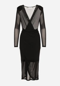 Czarna Sukienka Siateczkowa o Kopertowym Fasonie Aderila. Sukienka Siateczkowa o Kopertowym Fasonie Aderila to esencja nowoczesnej elegancji z nutą klasyki. Kopertowy krój pięknie podkreśla sylwetkę, a głęboki dekolt w kształcie litery V dodaje odrobiny zmysłowości. Długie rękawy i delikatne zdobienia czynią ją idealną zarówno na formalne wieczory, jak i swobodne wyjścia na randki. Sukienka posiada elastyczną podszewkę.