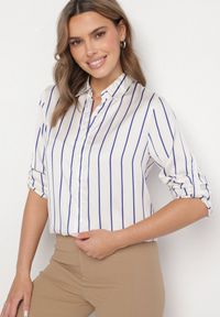 Biało-Niebieska Koszula w Delikatne Paski z Podpinanymi Rękawami Berraza. Koszula Berraza to kwintesencja klasy i nowoczesności, dzięki subtelnym paskom i podpinanym rękawom doskonale wpisuje się w aktualne trendy. Klasyczny kołnierzyk i delikatny dekolt w kształcie litery V dodają szyku, a luźny fason zapewnia komfort noszenia. Idealna na casualowe spotkania z przyjaciółmi w zestawieniu z jeansami i sneakersami, jak i na wieczorną kolację — wystarczy dodać do niej eleganckie spodnie i buty na obcasie. Musisz ją mieć!