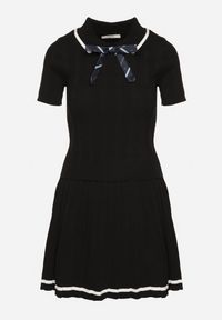Czarny Komplet ze Sweterkiem z Odpinaną Kokardką i Spódniczką w Stylu Mundurka Jorilne. Komplet Jorilne to idealne połączenie klasyki z modnym twistem, który zadowoli każdą miłośniczkę stylu. Sweterek z eleganckim kołnierzykiem polo doskonale współgra z plisowaną spódniczką o kroju mundurka, tworząc uniwersalny zestaw na każdą okazję. Przy kołnierzyku odpinana kokardka. Spódnica posiada gumkę w pasie. Wykonany z elastycznego materiału, zapewnia komfort noszenia przez cały sezon. Na co dzień zestaw z klasycznymi loafersami, a na formalne wyjścia dodaj eleganckie szpilki i subtelną biżuterię.