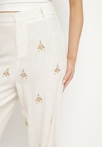 Biało-Beżowe Szerokie Spodnie z Lnem Wiskozą Wysokim Stanem i Haftami Ilonira. Szerokie Spodnie z Lnem Wiskozą Wysokim Stanem i Haftami Ilonira to doskonały wybór dla miłośniczek klasyki z nowoczesnym twistem. Wysoki stan na guzik i suwak oraz szeroka linia nadają elegancji, a subtelne hafty dodają unikalnego charakteru. Idealnie sprawdzą się na codzienne wyjścia z casualowym t-shirtem czy na wieczorne spotkanie z elegancką bluzką i szpilkami.