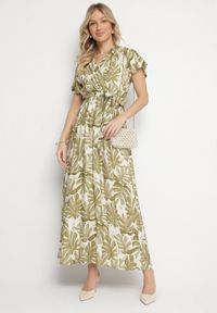Zielona Sukienka Ozdobiona Wzorem w Liście z Gumką i Paskiem w Talii Iselona. Sukienka Iselona to esencja stylu, którą pokochają miłośniczki klasyki z nutką nowoczesności. Luźna linia i zwiewny fason z gumką oraz paskiem w talii podkreślają sylwetkę, a krótki rękaw dopełnia całość na każdą okazję. Dekolt kopertowy o subtelnej głębokości nadaje elegancji, a wzór w liście wprowadza lekkość, idealną na wiosenne i letnie dni. Gumka w pasie po rozciągnięciu; s/m-99, l/xl-103, xl/xxl-105. Na co dzień łącz ją z espadrylami i dużą torebką, a na wieczór postaw na szpilki i delikatną biżuterię – zawsze będziesz wyglądać zjawiskowo!