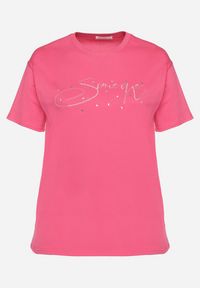 Różowy Bawełniany T-shirt z Ozdobnym Napisem i Cyrkoniami Olisandra. Bawełniany T-shirt Olisandra o prostym kroju z okrągłym dekoltem to idealna baza dla Twojej garderoby. Na froncie zdobi go subtelny napis uzupełniony błyszczącymi cyrkoniami, co doda Twojej stylizacji niepowtarzalnego charakteru. Doskonale sprawdzi się na co dzień w zestawie z jeansami i trampkami, a także podczas wieczornych wyjść – wystarczy dodać spódnicę midi i klasyczne szpilki. To must-have dla kobiet, które noszą plus size!