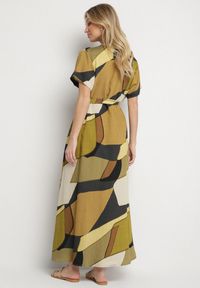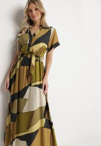 Zielona Sukienka Rozkloszowana z Wiskozy w Geometryczny Wzór z Paskiem Ranislla. Sukienka rozkloszowana Ranislla z wiskozy zachwyca geometrycznym wzorem, dodającym jej nowoczesnego charakteru. Dekolt w serek i subtelne guziki tworzą eleganckie wykończenie, a krótki rękaw zapewnia komfort noszenia w ciepłe dni. Wiązany pasek w talii podkreśla figurę, czyniąc ją idealną na różnorodne okazje. Na co dzień zestaw ją z białymi sneakersami i torebką na ramię, a na wieczór dodaj szpilki i delikatną biżuterię. Sukienka nie posiada podszewki.