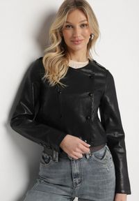 Czarna Kurtka Ramoneska z Ozdobnymi Guzikami Sesiania. Kurtka Ramoneska z Ozdobnymi Guzikami Sesiania na napy ze wsuwanymi kieszeniami to propozycja dla kobiet, które cenią sobie klasyczne rozwiązania z nutą nowoczesności. Posiada prosty krój i długie rękawy, dzięki czemu świetnie sprawdzi się zarówno na wieczorne wyjścia, jak i w codziennych stylizacjach. Ozdobne guziki dodają jej charakteru. Doskonała na sezon przejściowy, w połączeniu z ołówkową spódnicą i szpilkami stworzy elegancki look, a z jeansami i trampkami.