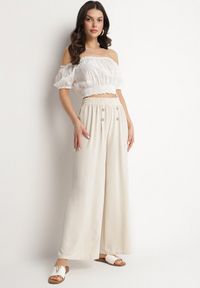 Jasnobeżowe Szerokie Spodnie z Bawełną Wysokim Stanem i Guzikami Avelritia. Odkryj elegancję w szerokich spodniach Avelritia z bawełną i gumką w pasie, które łączą nowoczesny fason z klasycznymi akcentami. Wysoki stan i guziki dodają im stylowego charakteru, a luźny krój doskonale podkreśla sylwetkę. Te spodnie świetnie sprawdzą się zarówno w codziennych stylizacjach, zestawione z białym t-shirtem i sneakersami, jak i na bardziej formalne okazje, z elegancką bluzką i szpilkami. Wybierz Avelritia i ciesz się modą bez limitów!