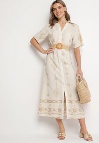 Beżowa Bawełniana Sukienka Koszulowa z Ozdobnym Paskiem i Haftem Evialisse. Odkryj elegancję w Bawełnianej Sukience Koszulowej z Ozdobnym Paskiem Evialisse z haftami na guziki. To idealna propozycja na wiele okazji – zarówno na casualowe spotkania, jak i na kobiece wyjścia. Sukienka ze wsuwanymi kieszeniami podkreśla kobiecą sylwetkę, a pasek akcentuje talię. Stylistyczne możliwości są nieograniczone: połącz ją z trampkami na co dzień lub postaw na eleganckie szpilki, by zamienić ją w idealny strój na formalne przyjęcie!