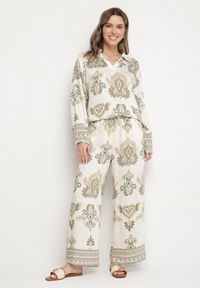 Żółty Komplet z Wiskozy w Etniczny Wzór Szerokie Spodnie i Bluzka T-shirt Polliviane. Odkryj wyjątkowy komplet Polliviane z wiskozy, który łączy komfort z modą! Etniczny wzór oraz swobodny fason sprawiają, że ten stylowy duet będzie idealny na ciepłe dni. Luźna bluzka z krótkim rękawem oraz szerokie spodnie z gumką w talii doskonale dopasują się do każdej sylwetki, zapewniając swobodę ruchów. Stylizuj go na co dzień z białymi sneakersami i torebką typu crossbody, a na formalne okazje dobierz eleganckie sandały i delikatne biżuterię – ten zestaw przyciągnie spojrzenia w każdej sytuacji!