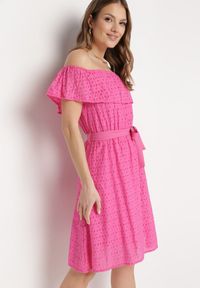 Fuksjowa Wiskozowa Sukienka Hiszpanka z Falbanami i Paskiem w Kwiaty Virmoi. Odkryj swoją nową ulubioną kreację na każdą okazję z Wiskozową Sukienką Hiszpanką z Falbanami i Paskiem w Kwiaty Virmoi. Jej fason z elastyczną podszewką i gumką w pasie sprawia, że doskonale podkreśla kobiece walory, a falbanki przydają jej zwiewności i romantycznego uroku. Z oryginalnym wzorem kwiatowym i paskiem z metalowym zapięciem, sprawiają, że sukienka staje się idealnym wyborem zarówno na codzienne spacery, jak i na wieczorne wyjścia. Stylizuj ją na co dzień z ulubionymi sandałami i denimową kurtką. Gumka w pasie po rozciągnięciu: S/M - 91 cm, M/L - 95 cm.