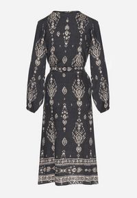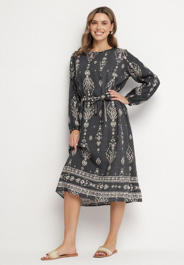 Ciemnoszara Sukienka we Wzory Boho Pudełkowa z Paskiem w Talii Lisanea. Sukienka we Wzory Boho Pudełkowa z Paskiem w Talii Lisanea to idealny wybór dla kobiet, które łączą aktualne trendy z klasyką. Jej luźny fason w kształcie litery A z pięknym dekoltem sprawia, że czujesz się swobodnie, a jednocześnie elegancko. Długie rękawy i zwiewny materiał doskonale sprawdzą się zarówno na co dzień, jak i podczas bardziej formalnych okazji. Połącz ją z ulubionymi botkami i delikatną biżuterią, aby stworzyć stylizację idealną na lunch z przyjaciółkami, lub załóż eleganckie szpilki i wyjątkowe dodatki na wieczorną kolację.