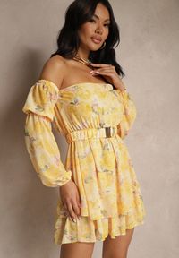 Żółta Sukienka Hiszpanka z Wiskozy w Kwiaty z Paskiem i Falbanami Zelmoi. Odkryj magiczny urok Sukienki Hiszpanki z Wiskozy w Kwiaty z Paskiem i Falbanami Zelmoi z elastyczną podszewką! Ta kreacja z dekoltem typu hiszpanka eksponuje ramiona. Talia podkreślona paskiem z metalowym zapięciem sprawia, że sylwetka wygląda smukło i zgrabnie, natomiast falbany nadają całości unikalnego, romantycznego stylu. Idealnie sprawdzi się na letnie spotkania z przyjaciółkami czy romantyczne randki, stylizowana ze szpilkami i torebką na łańcuszku. Na co dzień do jeansowej kurtki i sneakersów stworzy casualowy, modny look. Gumka w pasie po rozciągnięciu: S/M - 91 cm, M/L - 95 cm.