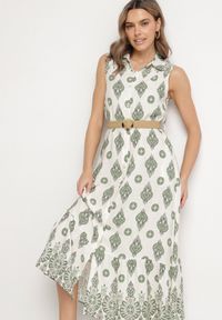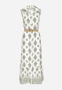 Zielona Wiskozowa Sukienka Koszulowa z Paskiem z Klamrą Eraniela. Sukienka Eraniela na guziki ze wsuwanymi kieszeniami to idealny wybór dla kobiet, które cenią sobie połączenie klasyki z nowoczesnym stylem. Jej dekolt w kształcie litery V eksponuje szyję i ramiona, a luźniejszy fason w połączeniu z paskiem z klamrą podkreśla talię, dodając kobiecej sylwetce lekkości. Doskonała na co dzień, w zestawieniu z eleganckimi espadrylami czy sportowymi trampkami, sprawdzi się również w formalnych okolicznościach z klasycznymi szpilkami i delikatną biżuterią. Wykonana z wiskozy, a subtelny wzór nadaje jej unikalnego charakteru, który przyciąga wzrok.