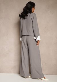 Szary Garniturowy Komplet Marynarka i Spodnie z Kontrastującymi Zdobieniami Davirielle. Stylowy komplet Davirielle to idealna propozycja dla kobiet, które cenią ponadczasową klasykę z nowoczesnym twistem. Marynarka o krótkim fasonie na guziki i szerokie spodnie świetnie sprawdzą się zarówno na casualowe wyjścia, jak i na formalne okazje – wystarczy zmienić dodatki! Zdobienia w kontrastującym kolorze przyciągają wzrok i dodają całości charakteru. Stylizuj go z koszulą i szpilkami na wieczorne spotkanie lub z T-shirtem i sneakersami na co dzień! Spodnie posiadają elastyczną gumkę w talii, wsuwane kieszenie oraz zapięcie na suwak i guzik.