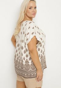 Biało-Brązowa Bluzka w Boho Wzór z Wiązaniem przy Dekolcie Jenalia. Odkryj urok bluzki Jenalia, która łączy w sobie boho swobodę z niepowtarzalnym stylem. Jej delikatny, luźny krój oraz subtelne wiązanie przy dekolcie sprawiają, że jest idealna na różne okazje – wystarczy, że zestawisz ją z jeansami i espadrylami na dzień lub spódnicą midi i szpilkami na wieczór. Wzór przyciąga wzrok, a przewiewny materiał sprawia, że bluzka będzie doskonałym wyborem na ciepłe dni.