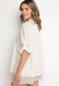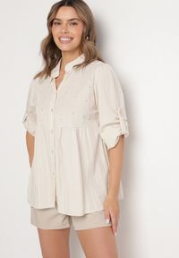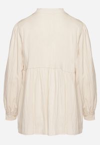Beżowa Koszula z Wiskozą Ozdobiona Perełkami Tanavitia. Oto koszula Tanavitia na guziki, która łączy elegancję z nowoczesnym stylem. Wykonana z wiskozą, ma długie rękawy i klasyczny kołnierzyk, który dodaje jej szyku. Subtelny dekolt z ozdobnymi perłami przyciąga wzrok i sprawia, że ta koszula staje się idealnym wyborem na formalne okazje oraz casualowe spotkania. Stylizuj ją z jeansami i sneakersami na co dzień, lub z eleganckimi spodniami i szpilkami, aby stworzyć zestaw na wieczorne wyjście.