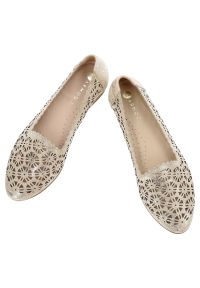 Złote Półbuty Armodo Eleganckie Obuwie Damskie. Półbuty ARMODO - 1974 2496 to doskonałe połączenie elegancji, komfortu i kobiecego uroku. Ich cholewka wykonana z wysokiej jakości skóry naturalnej licowej zachwyca delikatnym połyskiem, a także subtelnym ażurowym wzorem w kwiatowe motywy, który nie tylko przyciąga wzrok, ale również zapewnia świetną wentylację stopy. Niski obcas i miękka wkładka gwarantują wygodę przez cały dzień, czyniąc półbuty ARMODO - 1974 2496 idealnym wyborem do pracy lub na spotkania towarzyskie. Model w kolorze złotym z metalicznym akcentem pięknie komponuje się z wiosennymi i letnimi stylizacjami, dodając im lekkości oraz klasy.