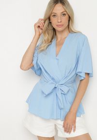 Jasnoniebieska Kopertowa Bluzka z Wiskozą Ozdobiona Supłem Tanathria. Wprowadź do swojej garderoby odrobinę elegancji z bluzką Tanathria z gumką z tyłu, która łączy w sobie lekkość wiskozy z modnym kopertowym krojem i wiązaniem. Krótkie rękawy i dekolt w serek dodają subtelności, a efektowny supeł podkreśla talię, sprawiając, że każda stylizacja nabiera charakteru. Idealna zarówno na co dzień, jak i na formalne wyjścia – zestaw ją z jeansami i sneakersami na brunch czy spódnicą ołówkową i szpilkami na ważne spotkanie. Ta bluzka to must-have dla każdej fashionistki szukającej uniwersalnych rozwiązań!