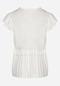 Biała Koszula z Wiskozą z Falbankami i Dekoltem w Kształcie Litery V Alivienne. Koszula z Wiskozą z Falbankami i Dekoltem w Kształcie Litery V Alivienne to doskonały wybór dla kobiet, które łączą klasykę z aktualnymi trendami. Posiada krótki rękaw i subtelny kołnierzyk, a dekolt w kształcie litery V dodaje jej elegancji. Dzięki lekkiemu fasonowi i falbankom koszula sprawdzi się doskonale zarówno na co dzień, zestawiona z jeansami i sneakersami, jak i na wyjątkowe wyjścia w połączeniu z ołówkową spódnicą i szpilkami. Wykonana z wiskozą.
