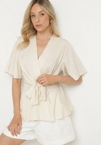 Jasnobeżowa Kopertowa Bluzka z Wiskozą Ozdobiona Supłem Tanathria. Wprowadź do swojej garderoby odrobinę elegancji z bluzką Tanathria z gumką z tyłu, która łączy w sobie lekkość wiskozy z modnym kopertowym krojem i wiązaniem. Krótkie rękawy i dekolt w serek dodają subtelności, a efektowny supeł podkreśla talię, sprawiając, że każda stylizacja nabiera charakteru. Idealna zarówno na co dzień, jak i na formalne wyjścia – zestaw ją z jeansami i sneakersami na brunch czy spódnicą ołówkową i szpilkami na ważne spotkanie. Ta bluzka to must-have dla każdej fashionistki szukającej uniwersalnych rozwiązań!