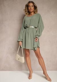 Ciemnozielona Rozkloszowana Sukienka z Gumką w Talii i przy Mankietach Tesunela. Odkryj urok rozkloszowanej sukienki z gumką w talii i przy mankietach Tesunela, która doda charakteru każdej Twojej stylizacji! Taliowany fason z elastyczną gumką, która rozciąga się o 13 cm, oraz delikatny dekolt subtelnie podkreślają sylwetkę, sprawiając, że sukienka sprawdzi się doskonale na każdą okazję — od romantycznej kolacji po popołudniowe spotkanie z przyjaciółkami. Stylizuj ją z ulubionymi botkami oraz torbą na ramię na co dzień, a na wieczorne wyjście postaw na szpilki i elegancką biżuterię. Efekt wow gwarantowany! Sukienka nie posiada podszewki.