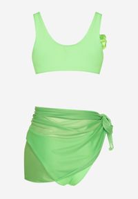 Jasnozielone Bikini Biustonosz z Odpinanym Kwiatem 3D Majtki Typu Figi i Siateczkowe Pareo Folane. Wprowadź do swojego letniego stylu odrobinę elegancji i świeżości dzięki bikini z odpinanym kwiatem 3D i wyjmowanymi miseczkami, które z pewnością przyciągnie spojrzenia. Figi o klasycznym kroju doskonale podkreślają sylwetkę, a zwiewne, siateczkowe pareo doda lekkości każdemu strojowi. Idealny na plażę lub przy basenie, ten zestaw sprawdzi się również podczas letnich imprez — wystarczy zestawić go z oversize'ową tuniką i stylowymi klapkami. Wybierz ten modny look i bądź gotowa na każdą okazję!