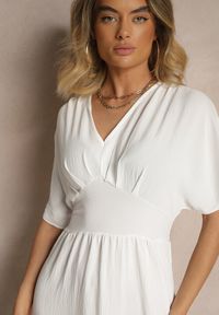 Biała Sukienka o Rozkloszowanym Kroju z Gumką w Talii Iffine. Sukienka o Rozkloszowanym Kroju z Gumką w Talii Iffine to idealny wybór dla wszystkich kobiet, które pragną połączyć wygodę z elegancją. Jej romantyczny dekolt w kształcie litery V oraz lekko rozszerzane, krótkie rękawy dodają szyku, a gumka w talii perfekcyjnie podkreśla sylwetkę. Świetnie sprawdzi się zarówno na co dzień w zestawieniu z sandałami i denimową kurtką, jak i na formalne wyjścia, połączona z eleganckimi szpilkami oraz delikatną biżuterią. Niezależnie od okazji, sukienka Iffine zapewni Ci modny wygląd i doda pewności siebie! Nie posiada podszewki.
