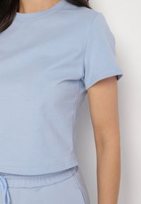 Jasnoniebieski T-shirt z Bawełny o Krótkim Kroju Galarina. T-shirt Galarina to must-have w szafie każdej kobiety, która ceni sobie zarówno komfort, jak i styl. Jego krótki fason z klasycznym okrągłym dekoltem gwarantuje uniwersalność, dzięki czemu możesz go stylizować na co dzień lub na formalne spotkania. Świetnie wygląda w połączeniu z jeansami i sneakersami, ale równie doskonale zaprezentuje się z elegancką spódnicą, marynarką i szpilkami, tworząc look w stylu smart casual. Wykonany z bawełny, T-shirt Galarina sprawdzi się doskonale w każdej sytuacji, zapewniając komfort noszenia. Musisz go mieć!