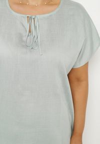 Jasnozielona Bluzka z Wiskozą Wiązana przy Dekolcie Dovarelle. Bluzka z Wiskozą Wiązana przy Dekolcie Dovarelle z linii plus size to niezwykle stylowy element garderoby idealny na każdą okazję! Z krótkimi rękawami i zaokrąglonym dekoltem doskonale wpisuje się w aktualne trendy, jednocześnie wyróżniając się ponadczasową elegancją. Wiązanie nadaje lekkości i swobody. Idealna na co dzień w połączeniu z jeansami i sneakersami lub w formalnej odsłonie z elegancką spódnicą i szpilkami – zawsze doda Ci pewności siebie i zapewni modny wygląd!