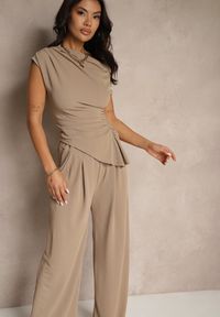 Jasnobrązowy Komplet Spodnie o Szerokim Kroju i Asymetryczna Bluzka z Marszczeniem Nitara. Komplet Spodnie o Szerokim Kroju z Asymetryczną Bluzką Nitara to perfekcyjny wybór dla wszystkich kobiet, które śledzą najnowsze trendy w modzie. Asymetryczny krój bluzki subtelnie podkreśla sylwetkę, a marszczenia dodają jej wyjątkowego charakteru. Spodnie o szerokim kroju ze wsuwanymi kieszeniami i gumką w talii zapewnia uniwersalność. Zestaw ten świetnie sprawdzi się na co dzień ze sneakersami i torebką shopperką, jak i do biura w połączeniu z marynarką i szpilkami — efekt wow gwarantowany!