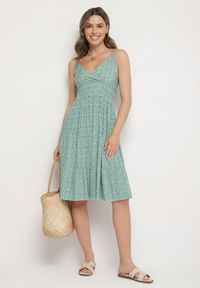 Zielona Bawełniana Sukienka o Rozkloszowanym Kroju na Ramiączkach w Kwiatowy Wzór Mirindra. Odkryj urok bawełnianej sukienki o rozkloszowanym kroju Mirindra, która zachwyca kwiatowym wzorem. Dekolt w kształcie litery V i regulowane ramiączka dodają lekkości, sprawiając, że będzie doskonałym wyborem na letnie dni. Idealna na różne okazje – od spacerów w parku po wieczorne wyjścia, wystarczy zestawić ją z sandałami na obcasie i marynarką lub klasycznymi trampkami oraz jeansową kurtką. Wykonana z bawełny i wyposażona w elastyczną gumkę w talii, która naciąga się o 10 cm, zapewni Ci modny wygląd i komfort noszenia w każdej sytuacji! Sukienka nie posiada podszewki.