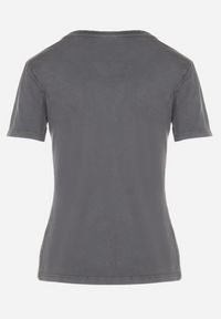 Ciemnoszary T-shirt z Bawełny Ozdobiony Napisami i Kwiatami Savierele. Odkryj niezwykły t-shirt Savierele z Bawełny, który łączy w sobie klasykę z nowoczesnym designem dzięki ozdobnym napisom i subtelnym kwiatuszkom. Klasyczny krój z zaokrąglonym dekoltem podkreśla kobiecą sylwetkę. Połącz go ze spódnicą midi i sneakersami na co dzień. Wykonany z bawełny.