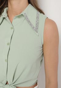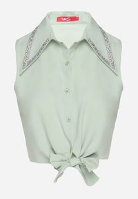 Zielona Koszula z Ozdobnym Kołnierzykiem z Cyrkoniami Revarelle. Odkryj niezrównaną elegancję i wyjątkowy styl dzięki koszuli Revarelle na guziki, wiązana na dole, która wyróżnia się dekoracyjnym kołnierzykiem zdobionym cyrkoniami. Jej krótki fason sprawia, że idealnie nadaje się na zarówno codzienne, jak i formalne okazje. Połącz ją z ulubionymi jeansami i sneakersami na luzie, lub zestaw ze spódnicą ołówkową i szpilkami na ważne spotkanie. Koszula odzwierciedla współczesne trendy, jednocześnie utrzymując klasyczny charakter, dzięki czemu będzie uniwersalnym elementem każdej szafy.