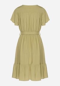 Zielona Wiskozowa Sukienka z Kopertowym Dekoltem i Paskiem Aurenelle. Wiskozowa Sukienka Aurenelle to kwintesencja ponadczasowego stylu. Jej kopertowy dekolt i dodatkowy pasek wraz z gumką w talii subtelnie podkreślają sylwetkę. Krótkie rękawy sprawiają, że idealnie nadaje się na wiosenne i letnie dni, a jej uniwersalny fason pozwala na wiele możliwości stylizacyjnych. Połącz ją z sandałami na obcasie i delikatną biżuterią na wieczorne wyjścia lub zestaw ją z trampkami i jeansową kurtką na co dzień! Sukienka nie posiada podszewki.