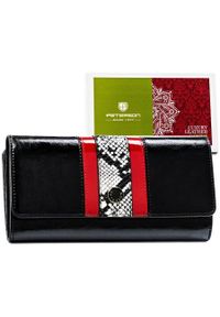 Portfel skórzany Peterson PTN BC-425214 czarny. Portfel ma elegancki, dwukolorowy design, łączący połyskującą czerń z delikatnym złotem. Zaprojektowany bardzo funkcjonalnie. Pomieścisz w nim pokaźne ilości kart, dokumentów oraz gotówki. Portfel wyposażony w system STOP RFID.