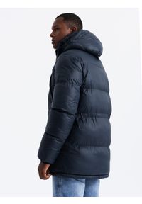 Męska długa kurtka puffer z zapinanymi kieszeniami – granatowa V3. Nylonową kurtkę puffer z elementami polaru warto mieć ze sobą podczas zmiennej pogody. Ma technicznie wzmocniony materiał wierzchni oraz porządne wypełnienie, dzięki czemu jest dostosowana do nieprzyjaznych warunków atmosferycznych. Zwolennicy praktycznych rozwiązań z pewnością docenią dużą ilość zapinanych kieszeni. Regulowany kaptur, pas i dół umożliwiają dopasowanie kurtki do indywidualnych preferencji. męska kurtka typu puffer duża ilość wypełnienia materiał wzmocniony hydrofobową powłoką zapięcie na zamek błyskawiczny z krytą plisą na zatrzaski cztery przednie kieszenie zapinane na zatrzaski wewnętrzna zapinana kieszeń w podszewce wysoki kołnierz z regulowanym kapturem kieszenie, kołnierz i kaptur z polarowym podszyciem regulowany pas i dół kurtki podwójny mankiet ze ściągaczem od wewnątrz prostokątna naszywka z brandingiem materiałowy wieszak Skład: materiał wierzchni – 100% nylon materiał dodatkowy – polar – 100% poliester podszewka – 100% nylon wypełnienie – syntetyczne kolor: granatowy