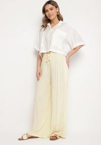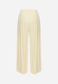 Jasnożółte Spodnie z Szerokimi Nogawkami i Gumką w Pasie Helnena. Wprowadź do swojej garderoby odrobinę swobody dzięki spodniom Helnena z szerokimi nogawkami i elastyczną gumką w pasie. Ich unikalny fason świetnie sprawdzi się zarówno na co dzień, jak i podczas formalnych okazji – zestaw je z białą koszulą i szpilkami na wieczorne wyjście lub T-shirtem i sneakersami na weekendowy spacer. Inspirowane aktualnymi trendami, te spodnie doskonale łączą nowoczesny styl z klasycznym krojem ze wsuwanymi kieszeniami. Wykonane z przyjemnego, wiskozowego materiału, będą doskonałym wyborem na każdą porę roku!