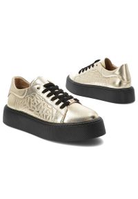 Złote Sneakersy Filippo Modne Obuwie Damskie. Sneakersy FILIPPO - DP6119/25 GO Złoty to odważna propozycja dla kobiet, które lubią wyróżniać się z tłumu i łączyć modę z wygodą. Błyszczący złoty materiał przyciąga spojrzenia, a geometryczny wzór na bocznym panelu dodaje oryginalności oraz miejskiego charakteru. Solidna czarna platforma zapewnia stabilność, a także subtelnie wydłuża sylwetkę, jednocześnie wpisując się w najnowsze trendy streetwearowe. Miękka wkładka i klasyczne sznurowanie gwarantują wygodę noszenia przez cały dzień. Sneakersy FILIPPO - DP6119/25 GO Złoty to idealny wybór dla kobiet ceniących wyrazisty styl oraz komfort bez kompromisów.