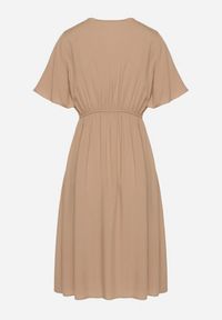 Ciemnobeżowa Bawełniana Sukienka o Rozkloszowanym Fasonie Liranelle. Odkryj wyjątkową sukienkę Liranelle, która łączy styl z wygodą! Jej rozkloszowany fason z gumką w pasie, która rozciąga się o 18 cm, idealnie eksponuje sylwetkę, a dekolt w kształcie litery V nadaje elegancji. Krótkie rękawy sprawiają, że to doskonały wybór na letnie dni, a subtelny design podkreśli Twoją indywidualność. Stylizuj ją na co dzień z ulubionymi trampkami i denimową kurtką lub w wersji formalnej zestaw ją z eleganckimi szpilkami i biżuterią, by stworzyć idealną kreację na wieczorne wyjście! Sukienka nie posiada podszewki.