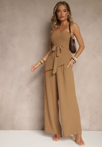 Jasnobrązowy Komplet Spodnie o Szerokim Kroju i Asymetryczna Bluzka Ralinessa. Ten wyjątkowy komplet Ralinessa z szerokimi spodniami z paskiem i wsuwanymi kieszeniami i asymetryczną bluzką to kwintesencja kobiecej elegancji, która jednocześnie podkreśla casualowy styl. Wzór o asymetrycznym kroju dodaje lekkości, a subtelne zdobienia wyróżnią Cię w tłumie. Świetnie wypadnie w zestawieniu z klasycznymi szpilkami oraz minimalistyczną torebką, tworząc harmonijną całość na wieczorne wyjście z przyjaciółkami.