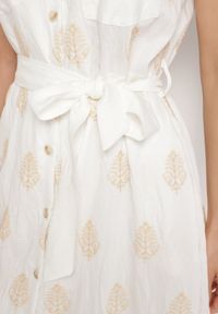 Biała Wiskozowa Sukienka Koszulowa w Hafty z Paskiem Araverra. Odkryj naszą Wiskozową Sukienkę Koszulową w Hafty z Paskiem Araverra, która łączy w sobie elegancję z niezobowiązującym stylem. Jej subtelny, klasyczny fason z gumką w pasie na guziki z paskiem tworzy doskonały balans. Świetnie sprawdzi się na codzienne wyjścia w połączeniu z ulubionymi sneakersami, ale także na bardziej eleganckie okazje, gdy zestawisz ją ze szpilkami i delikatną biżuterią. Wykonana z lekkiej wiskozy, będzie idealnym wyborem na wiosenne i letnie dni, pozwalając Ci czuć się modnie.