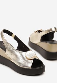 Złote Wsuwane Sandały ze Skóry Naturalnej na Koturnie z Metalową Aplikacją Risspa. Sandały Vices na Koturnie z Ozdobą Atalira to idealny wybór dla nowoczesnej kobiety, która stawia na styl. Koturn dodaje pewności siebie, a ozdobny detal z przodu przyciąga spojrzenia i dodaje charakteru każdej stylizacji. Te sandały doskonale sprawdzą się zarówno na co dzień, w połączeniu z lekką sukienką, jak i na wieczorne wyjścia, zestawione z eleganckimi spodniami i bluzką.